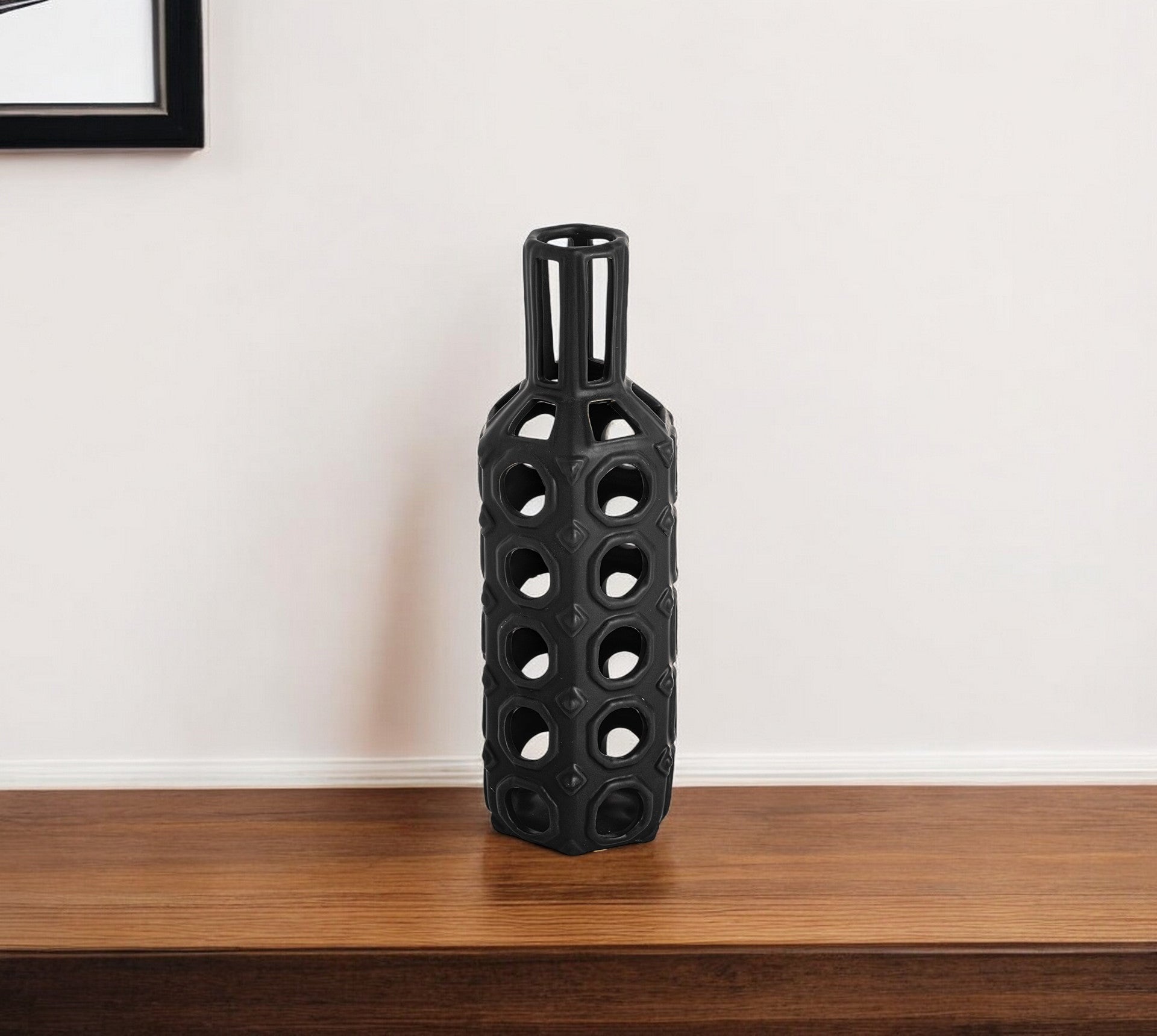 This 12-inch black ceramic abstract cylinder table vase is a stunning centerpiece for any modern decor. This vase is made from ceramic and has a stunning semi-matte black finish on it. The base of the vase has a narrow domed shape with circular cut-outs. These circles shapes get smaller as they move up the body of the vase. There are small diamond geometric details in between these shapes and vertical rectangular shapes towards the top that add to the unique design. 12-inch H x 4-inch W x 4-inch D